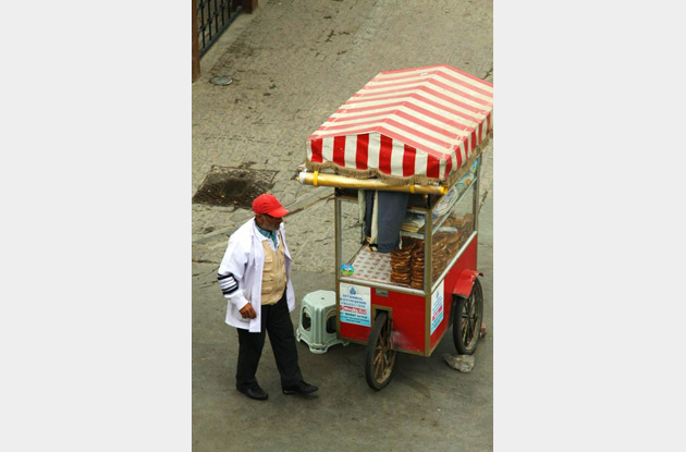 Dieser Straßenhändler bereitet in aller Früh seinen Stand mit Sesamkringeln vor. Die sogenannten Simit sind ein beliebter Snack für Zwischendurch und werden zu jeder Tageszeit gegessen. |