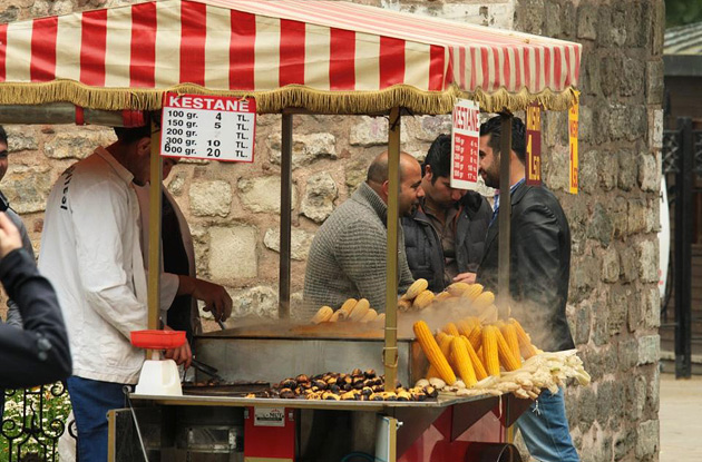 An jeder Ecke werden gekochte oder gegrillte Maiskolben sowie duftende, geröstete Kastanien angeboten. |