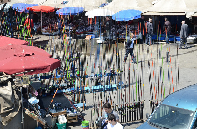 Unterhalb der Galatabrücke verkaufen Händler allerlei Zubehör für Hobbyangler. |