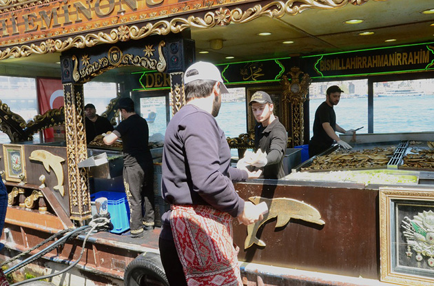 Am Kai von Eminönü werden in historisch gestalteten Kähnen Fischbrötchen verkauft. |