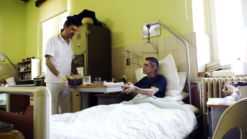 Seit 18 Jahren teilt er mit vier Männern ein Zimmer: kalte Fliesen, grün bemalte Wände, ans Bett gefesselt. Murtaza ist querschnittsgelähmt und mit Hepatitis C infiziert. Drei Kanarienvögel zwitschern durchs Zimmer, sechs Fische schwimmen im Aquarium, ein paar Topfpflanzen stehen vor dem Fenster. An der Wand hängt ein einziges Bild, eine alte Frau, die Murtaza aus einer Zeitung geschnitten hat, weil sie ihn an seine Großmutter erinnert.